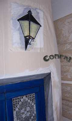 Algunos de los objetos que van en la pared los pinté en trocitos de tela aparte, como el farol.